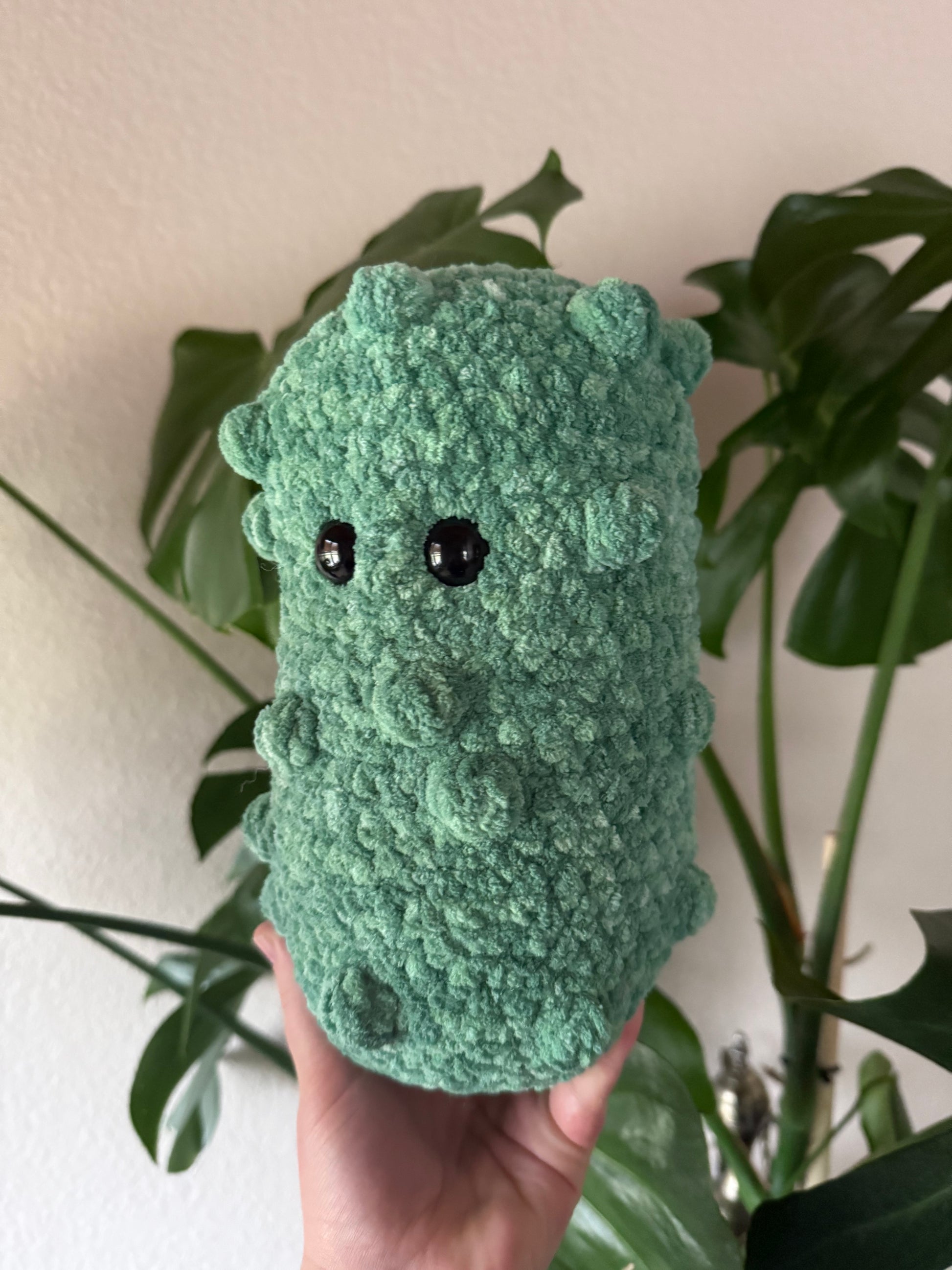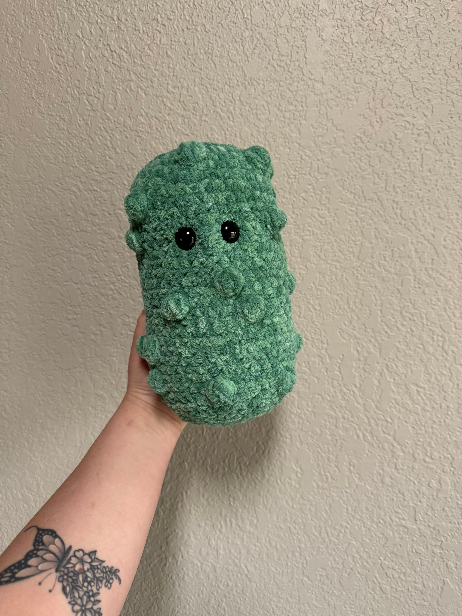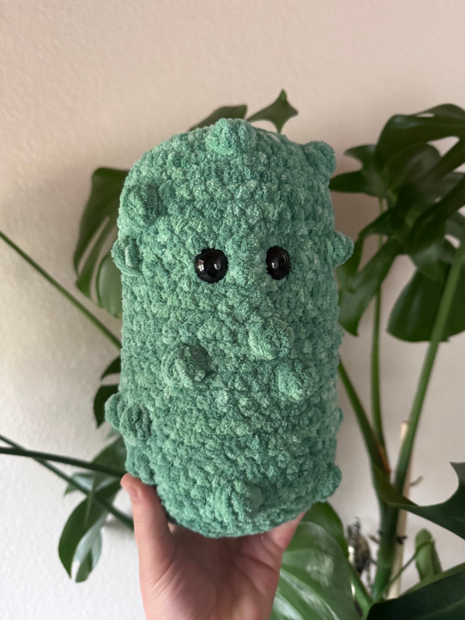 This crochet giant pickle is stitched with extra soft Bernat Blanket variegated yarn, super cuddly, and sits at ~15 inches tall! He’s plump, has the perfect large eyes, and is ready for any couch, bed, or arms to settle down in. He’s quite a big dill for any pickle lovers!